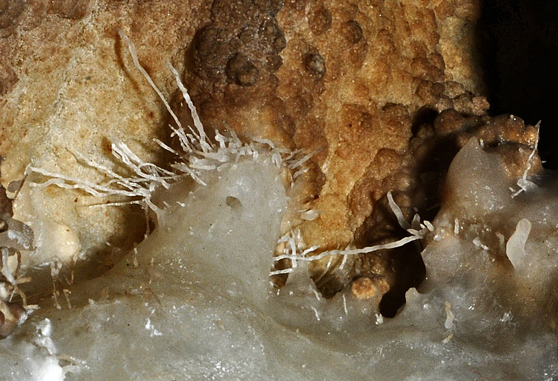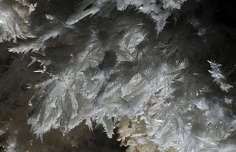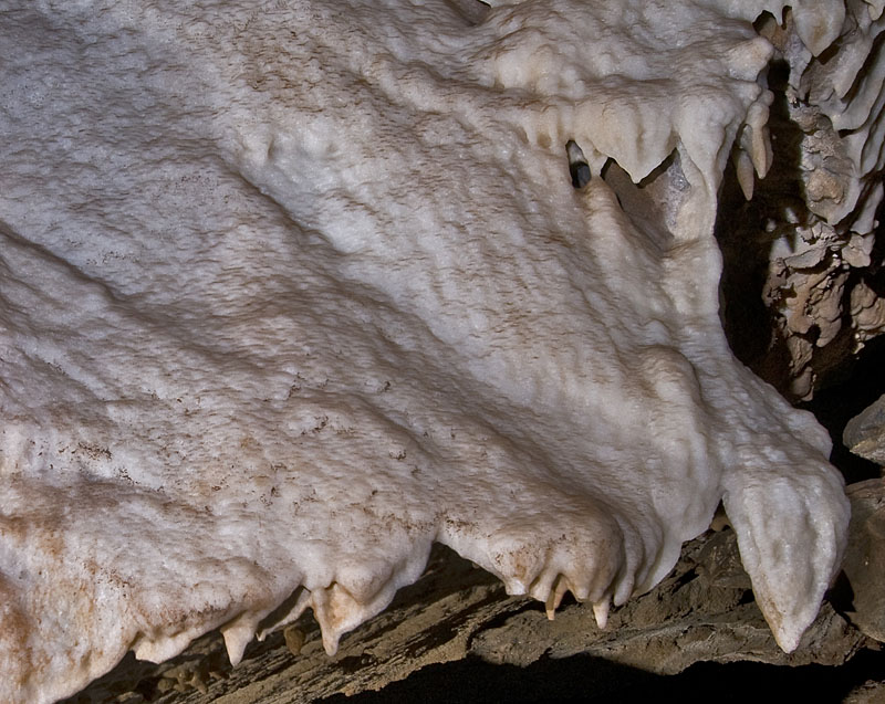 In a final frosting of the Caverns, solutions rich in calcium carbonate deposited walls of delicate aragonite crystals in the far recesses of the cave. As the minerals concentrated in what little solution remained, uncommon, blue-white, cream cheese-like hydromagnesite moonmilk formed on cave passage walls and on the spiky aragonite crystals. Resembling miniature ice-sheathed trees, this showy display of aragonite is so outstanding that a special prize was awarded to the Mercers at the 1900 Paris World's Fair.