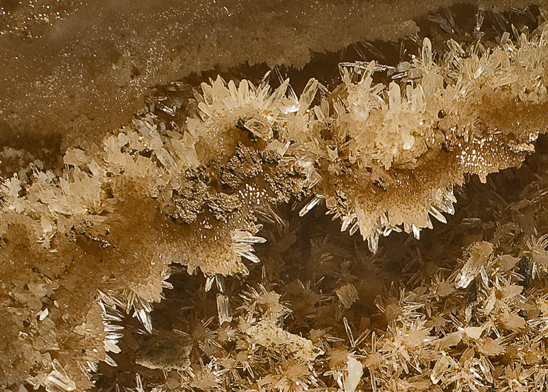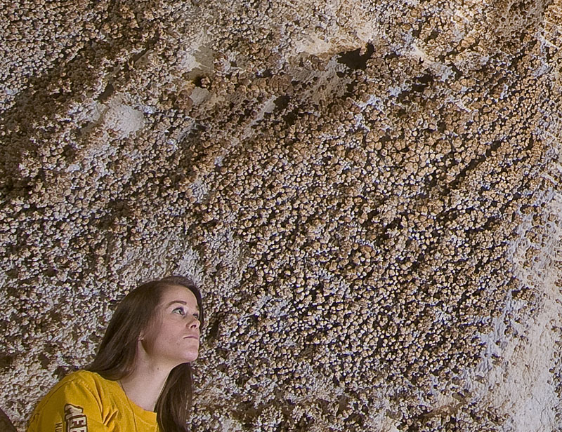 The Cavern’s decorations have formed from seeping and dripping water that is highly charged with dissolved calcite, the primary mineral in the marble. Percolating ground water picks up carbon dioxide generated as a waste product by soil bacteria and slowly dissolves the marble as it traverses down into the bedrock. When these solutions seep out onto the cave walls, the entrapped carbon dioxide boils out of the solutions much like an uncapped soda bottle, dropping its calcite load to deposit the myriad of forms decorating the Caverns. In the lowest sections of the cave, ponded water saturated with calcite encrusted everything with spiky, orange dogtooth spar crystals upwards of 2 inches long. Higher in the cave, ground water pressure was fed through tiny imperfections in the calcite sheathing and formed twisted, medusa-like helictites ranging from a hair’s thickness to massive 2-foot-long “lobster claws.”