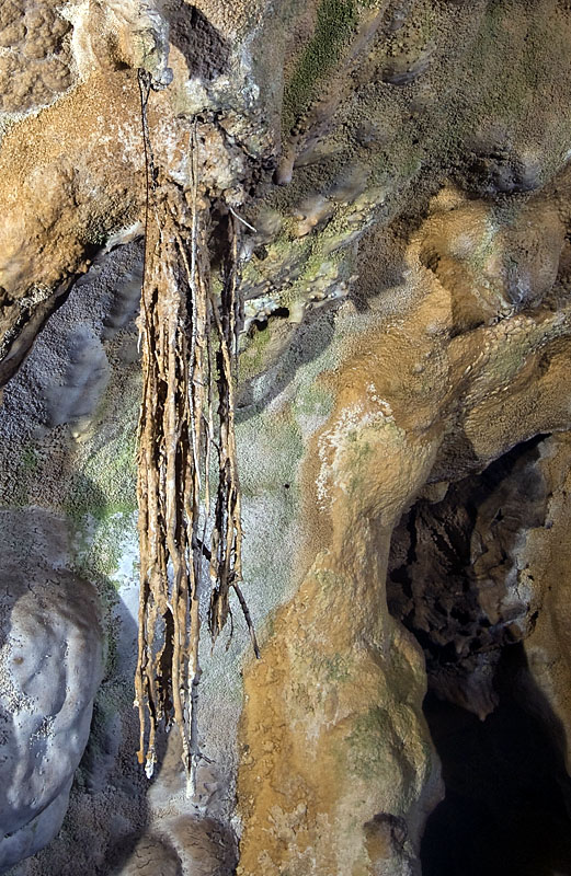Other seeping water slowly formed popcorn or coral-like decorations called coralloids. Gently flowing water, agitated by imperfections on the Cavern walls, also expelled their dissolved carbon dioxide and dropped their calcite load to form sheets of flowstone that resemble frozen waterfalls. In some places, seeping water, again under pressure, formed hollow calcite cave blisters among the coralloids and stalactites that later were partly filled with clay and “opal”. An unusual type of stalactite is found in the cave, where roots penetrating the roof have been coated to form rootsicles.