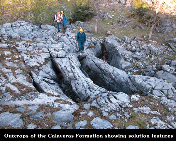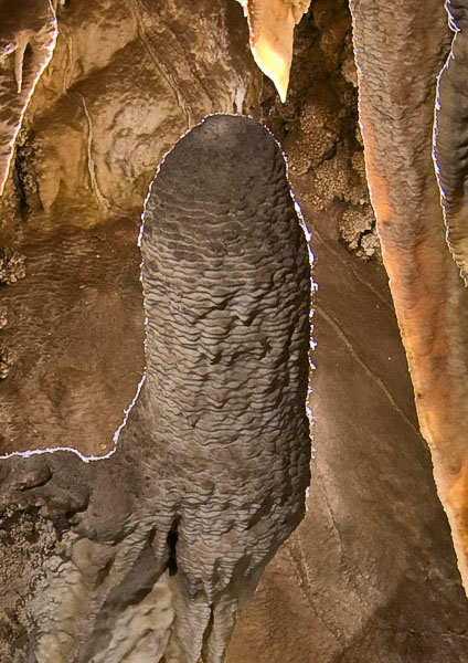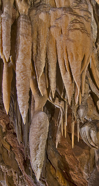 Mercer Caverns formed in a large lens of recrystallized limestone and dolomitic limestone of the Calaveras Group, a wastebasket of miscellaneous slabs and slivers of rock found throughout the Sierra Nevada. In the vicinity of the Caverns, these scraps of ancient ocean floors, tropical atolls, and long-vanished continents appear to date from the 280-million-year-old Permian Period. These rocks were originally formed in past seas and stitched onto the western edge of North America by plate tectonics until just before the Age of Dinosaurs. Conditions changed by the time of the Miocene Epoch, which arrived some 24 million years ago. It appears that by the waning of the Miocene some 6 million years ago, acid-charged ground water in the tree-dotted savanna had already seeped down the cracks and fissures of the limestone and dissolved out the cave. As adjacent San Domingo Creek scoured its channel deeper, the cave slowly drained and, deprived of the ground water’s buoyant support, large sections of the cave’s ceiling collapsed. The nearly two million years of the Ice Ages came and went, leaving their mark on the cave as a series of ocherous clay deposits interspersed with massive calcite flowstone cascades and stalagmites. With the final waning of the ice sheets some 10,000 years ago, the walls of the Caverns were covered with thick deposits of calcite dripstone of all shades of white, cream, orange, and brown.