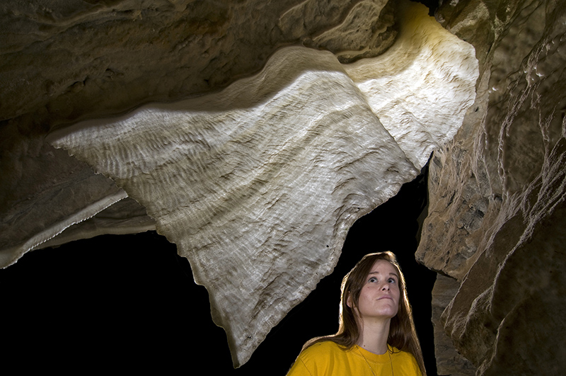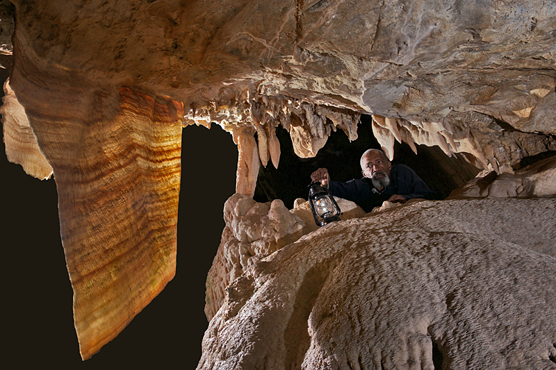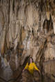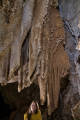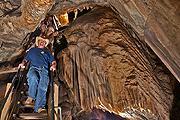 Mercer Caverns Manager Bernard peers down the top of the Organ Loft next to the Angel Wings